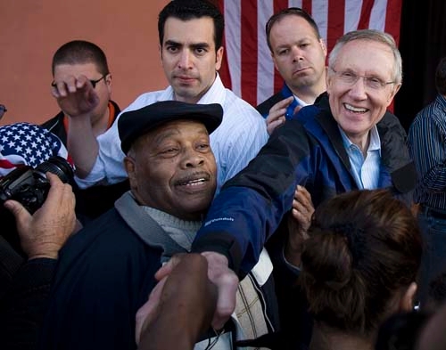 "We love you Harry," friends, neighbors and longtime Democratic Party backers shouted from inside the Searchlight Nugget where 86-year-old owner Verlie Doing and former U.S. Sen. Richard Bryan stood by Reid to help start his bid for a fifth term.