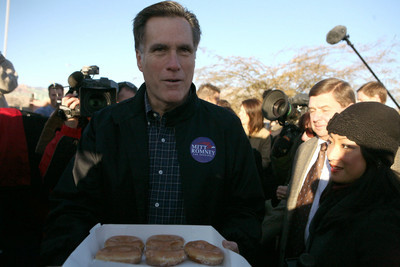 The presidential hopeful shook hands and passed out Krispy Kreme doughnuts in the near-freezing temperatures.