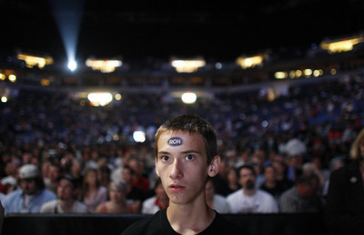 A few hours before Paul was scheduled to speak, the arena already was mobbed, with acolytes lining the sidewalk outside to chant, "Ron Paul revolution -- bring back the Constitution."