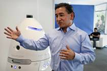 Security guard Eric Leon watches the Knightscope K5 security robot as it glides through the mall, charming shoppers with its blinking blue and white lights.