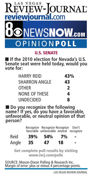 U.S. Sen. Harry Reid and GOP challenger Sharron Angle tied with 43 percent of the vote in a new poll that suggests most Nevadans won't gamble on half a dozen other little known contenders.