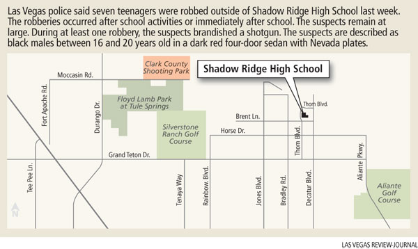 Las Vegas police said they suspect the same group of at least four males robbed seven students in three separate incidents last week. All the robberies occurred in the area around the school, 5050 Brent Lane, near Decatur Boulevard in the northern edge of the valley.