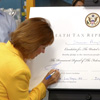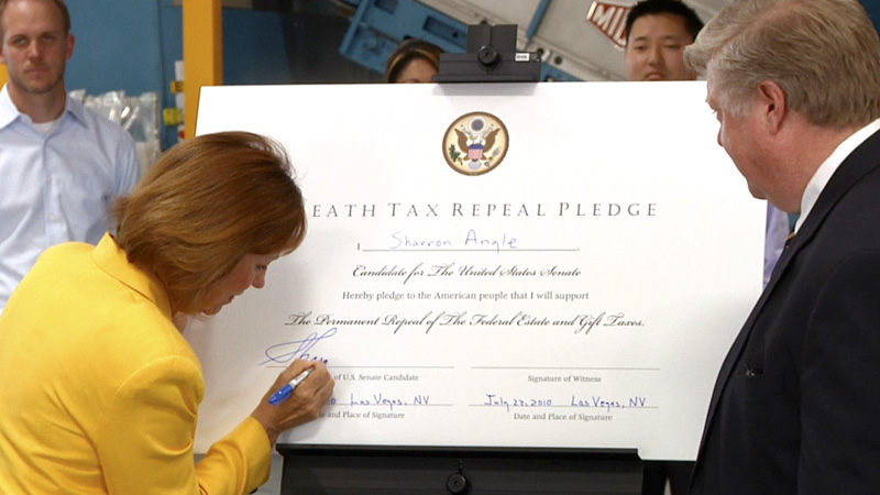 Sharron Angle, republican candidate for U.S. Senator, held a press conference at Brady Industries to sign a pledge to repeal the estate tax. Angle also spoke to a local women's republican club. Angle's camp continued to limit questioning by the media, allowing only questions related to the estate tax.