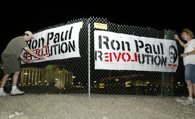 It was shortly after 8 a.m. Wednesday as Atkins, nurse Mike Gray, 27, and music education student Sarah Kulkin, 23, stood in the parking lot of the Eastgate Apartments off Nellis Boulevard and looked at the weaponry they had made the night before -- signs and banners bearing the words "Ron Paul REVOLUTION," with the letters "EVOL" written backwards and in red: love.