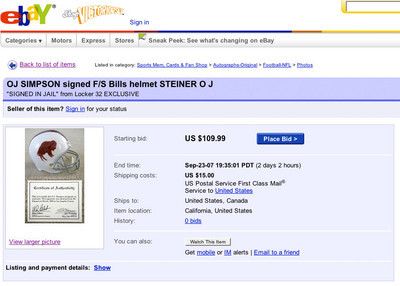 Fromong is hawking for $109.99 a Buffalo Bills helmet that O.J. Simpson signed while in jail. The highest bid on Friday afternoon was $15.