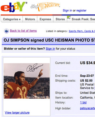 Other eBay sellers aren't having much better luck. One seller hopes to collect $395 for a 1970 plastic O.J. Simpson cup signed by the Juice. The highest bid was $14.95. Sixteen months' worth of tapes of Simpson's trial on murder charges is offered for $500. The highest bid? Ten bucks.