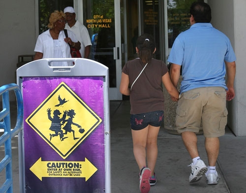 But instead of a seaside resort, the horror unfolds each spring on the steps of North Las Vegas City Hall.
