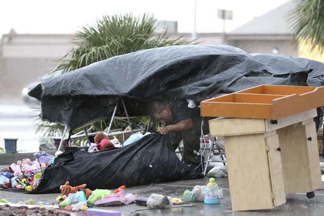 A man who declined to give his name tries to protect the items he was selling at his roadside stand during a downpour on East Lake Mead Boulevard near North Nellis Boulevard Monday. (K.M. Cannon/Las Vegas Review-Journal)
