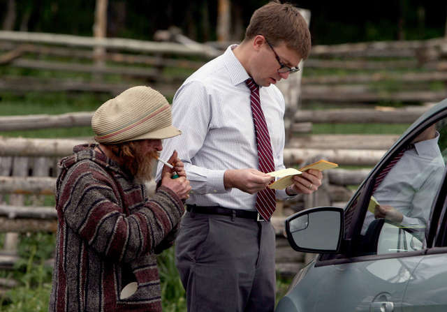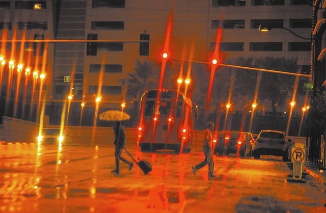 JEFF SCHEID/LAS VEGAS REVIEW-JOURNAL People cross Ogden Avenue and First Street on Monday. A thunderstorm pelted the valley with high winds and rain. NV Energy reported that wind knocked out power to 2,000 customers. This year, the valley has received 1.24 inches of rain. Last year, up to Sept. 6, almost