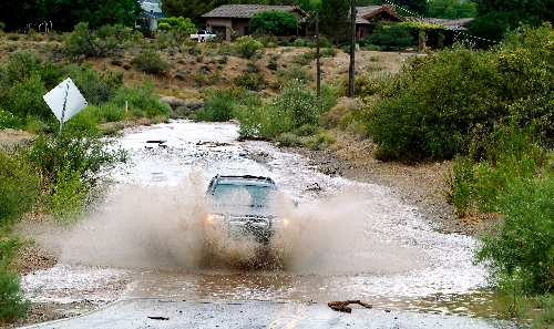 Most of the storm had dissipated by 4:30 p.m., and higher-clearance vehicles were able to cross the wash at Bonnie Springs. The scenic drive was scheduled to reopen today .