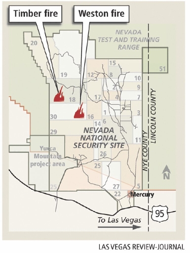 The fires are in a remote section of the 1,360-square-mile government test site, and no structures were threatened, spokeswoman Dona Merritt of the U.S. Department of Energy said. Firefighters from the security site and the Bureau of Land Management were battling the blazes, and officials were waiting for field reports revealing whether the fires were contained or spreading late Tuesday, Merritt said.