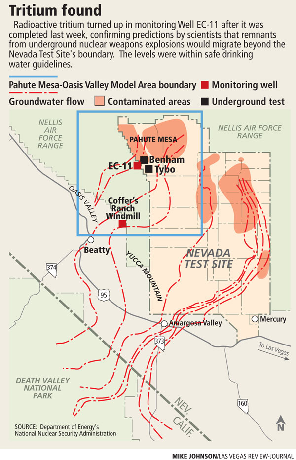 Scientists said in July they probably would find tritium after completion of Well EC-11 near the northwest edge of the test site. Underground tests Benham and Tybo were detonated in Pahute Mesa, two miles from that location in 1968 and 1975, respectively.
