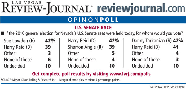 The telephone poll of 625 registered Nevadans who said they vote regularly has a margin of error of plus or minus 4 percentage points.