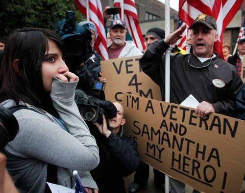 Pawlucy, whose family had expressed concern for her safety, returned Tuesday after a rally that featured supporters singing the national anthem and reading the First Amendment - as well as shouts of supporters calling "Go, Sam!" and "You're great, Sam!"