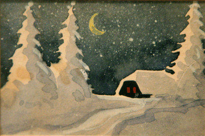 But it was the postcard rendering of a snow-covered cabin, flanked by white-flocked evergreens below a crescent moon on a starry night, perhaps in Germany or Austria, that was the focus of her conversation.