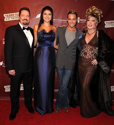 Mirage headliner/ventriloquist Terry Fator pitched provided his support to The Public Education Foundation (PEF) with a special performance of "Terry Fator: Ventriloquism in Concert" on Sunday at the Terry Fator Theatre at The Mirage. Left to right: Fator; his girlfriend, Taylor Makakoa; Frank Marino; and "Peepshow" star Josh Strickland. (Photo courtesy Scott Harrison/Retna)