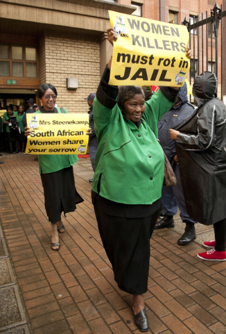 Saayman stood through his testimony to indicate the location of Steenkamp’s bullet wounds by touching his hand to his own head, arm and hip. He noted that Steenkamp also had a wound on her left hand, possibly from a bullet, and described abrasions and smaller injuries caused by splinters, which he said were consistent with bullets fired through a wooden object.