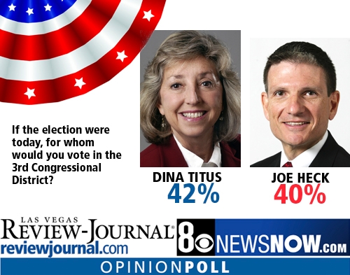 In April, Heck was narrowly leading in the race, 49 percent to 44 percent, according to a previous Mason-Dixon poll for the Review-Journal with a margin of error of 6 points. Coker attributed the Heck bump then to passage of the health care law, which most Nevadans don't like and which Titus supported and Heck opposes.