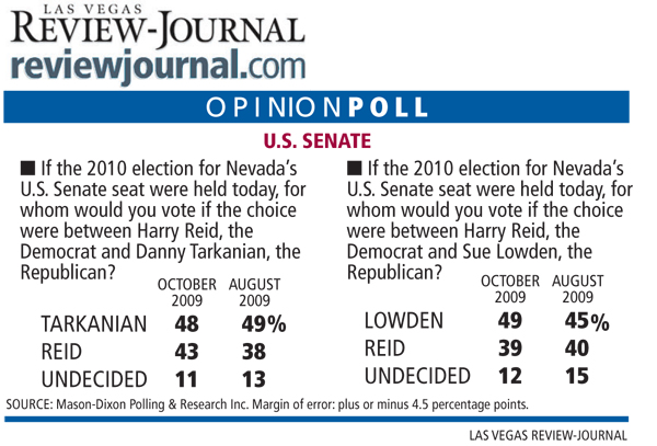 In one general election scenario, 49 percent of respondents picked Lowden and 39 percent chose Reid. In another, 48 percent picked Tarkanian to 43 percent for Reid. That poll, which surveyed 500 voters Tuesday through Thursday, has a margin of error of plus or minus 4.5 percentage points.