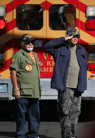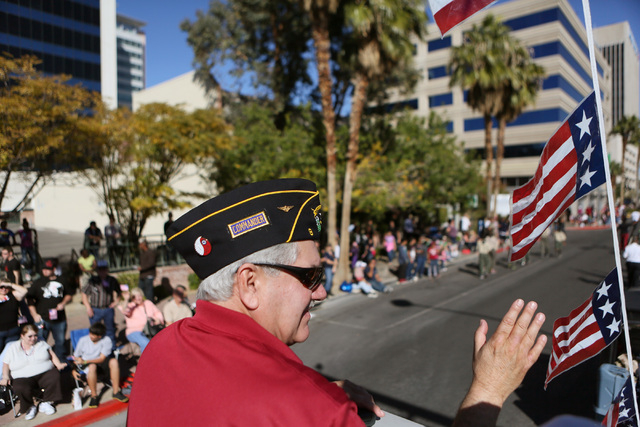 One man carried an electric, “U.S. Vet” neon sign. Some entries came from outside Nevada, like the truckload of 3rd Armored Cavalry Vietnam veterans from Ventura, Calif. Junior ROTC units and bands from local schools marched behind a slew of vintage military vehicles and fire trucks with sirens blaring.