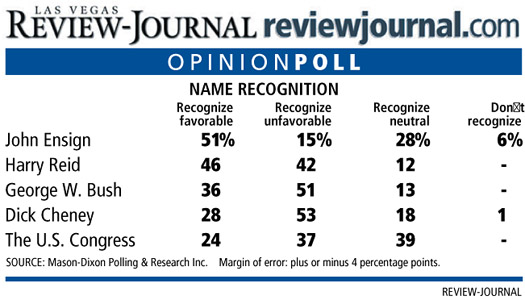 Nevada's junior senator, Republican John Ensign, fared better. Despite voters' opposition to a war policy and president that Ensign supports, Ensign was viewed favorably by 51 percent of those surveyed, unfavorably by 15 percent and neutrally by 28 percent.