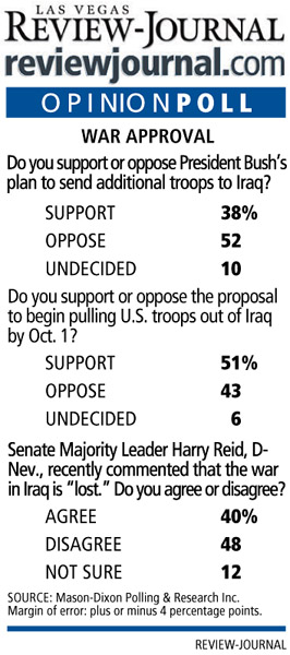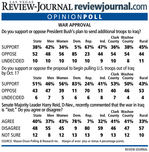 Nevada voters oppose President Bush's policy in Iraq and support a pullout of U.S. troops, albeit by narrow margins, according to a Review-Journal poll.