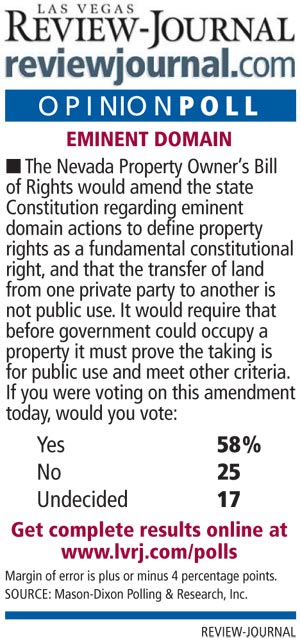 By more than a 2-to-1 margin, Nevada voters polled by the Review-Journal said they will pass a constitutional amendment in Tuesday's election to prevent government from using the power of eminent domain to seize private property and then turn it over to developers.