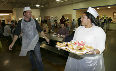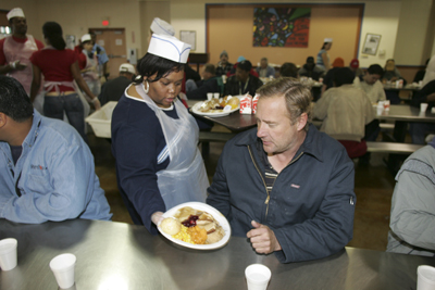 On a wet and cloudy Thanksgiving, the dining hall at the Catholic Charities campus in downtown Las Vegas was comfortable and dry, with cheerful volunteers streaming steadily out of the kitchen with plates of food heaped with turkey and fixings.
