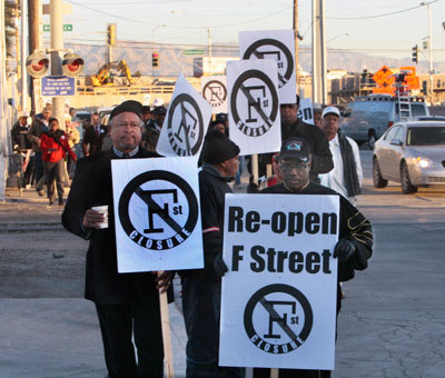 The march follows a lawsuit seeking to reopen F Street, which state transportation officials fear could cost taxpayers an extra $30 million should it be successful and result in a redesign and reconstruction of that portion of the interstate.