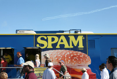 Oh no. They were waiting to get Spam, which some non-Spam lovers have said stands for "Something Posing as Meat." An estimated 10,000 people, according to Brian "Spamoni" Callerame, field marketing manager for the Spammobile parked at Nellis, were waiting to be served one-inch squares of chopped pork shoulder meat that also has ham, salt, water, sugar and sodium nitrite to help "keep its color."