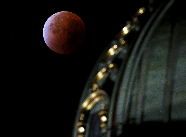 The Moon, appearing in a dim red colour, is covered by the Earth‘s shadow during a total lunar eclipse over Paris, France September 28, 2015. (Reuters)