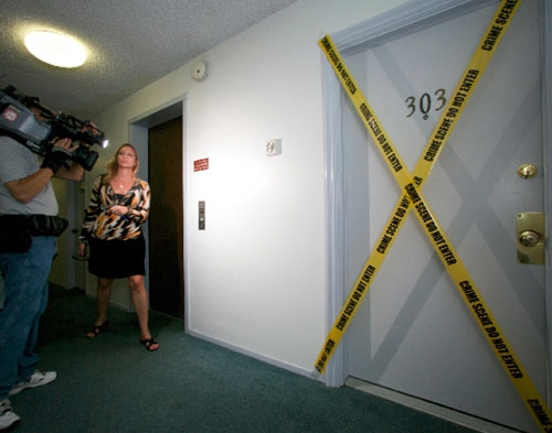 The door to unit 303 remains sealed with police tape as FBI agents continue to pick the place apart, but a line of would-be renters is already jostling to get a look at the apartment once occupied by America's most wanted criminal.