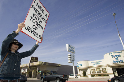Tower of Jewels took Bickel to court last month after she hoisted signs in front of the store that read: "I have a problem with Tower of Jewels" and "I want my cash back Jack."