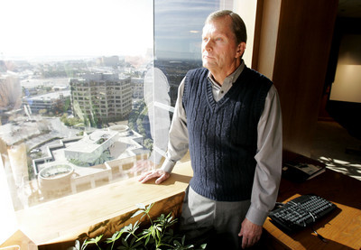 Attorney Bruce Woodbury glances out a high-rise window that shows craggy mountains in the distance and ribbons of traffic that look like so many Matchbox cars.