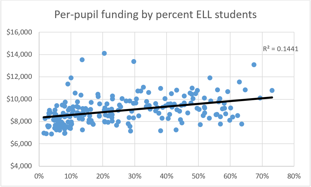 This happens in part, because the district spends more at schools with large populations of students eligible for Free and Reduced Lunch, a 26 percent positive correlation with higher spending, and ELL students, a 14 percent positive correlation with more funds.