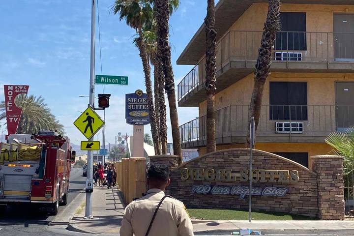 Four Las Vegas police officers were injured early Friday as they went door-to-door at a downtown Las Vegas apartment complex, alerting residents to a blaze.
