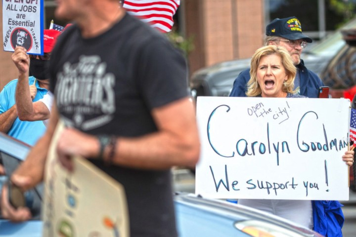A group of Nevadans protesting stay-at-home orders drove down the Strip in the pouring rain on Easter Sunday.