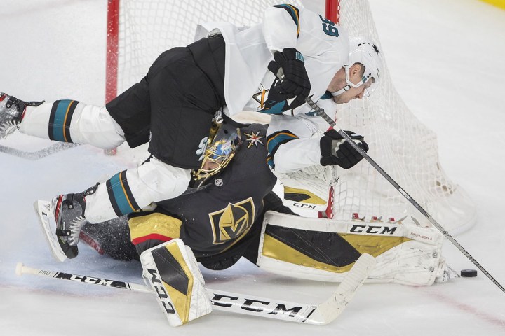 San Jose’s Logan Couture scored with 1:40 remaining in a back-and-forth overtime, as the Golden Knights lost 2-1 to the Sharks on Thursday night at T-Mobile Arena.
