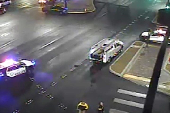 A preliminary investigation indicates a taxi ran a red light and hit a truck, causing the cab to spin and strike the female pedestrian in a downtown intersection, Las Vegas police said.