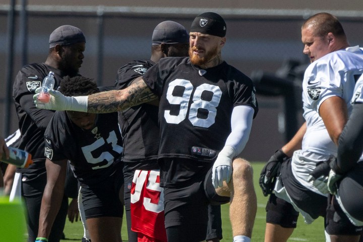 Maxx Crosby’s fiancee was due to give birth to the couple’s first child on Monday, but they are still waiting. He hopes it doesn’t impact his availability against the Chiefs.