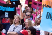 Busloads of women attending a Teamsters convention in Las Vegas dropped by City Hall on Thursday to join a protest against Republic Services for firing 29 Hispanics who were allegedly attempting to unionize recycling center workers.
