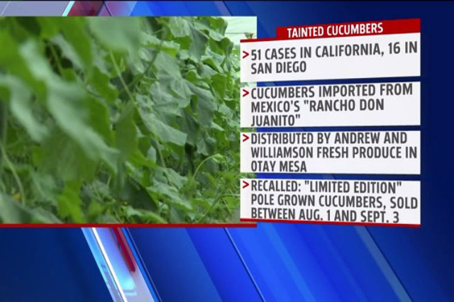 A California produce company is recalling cucumbers imported from Mexico amid concerns they could be the source of a salmonella outbreak that has killed one person and infected at least 285 people in 27 U.S. states, authorities said.