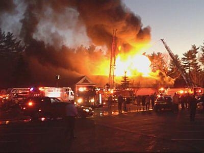 Authorities say a three-alarm fire broke out at a wedding outside Boston just after the bride and groom were pronounced husband and wife.