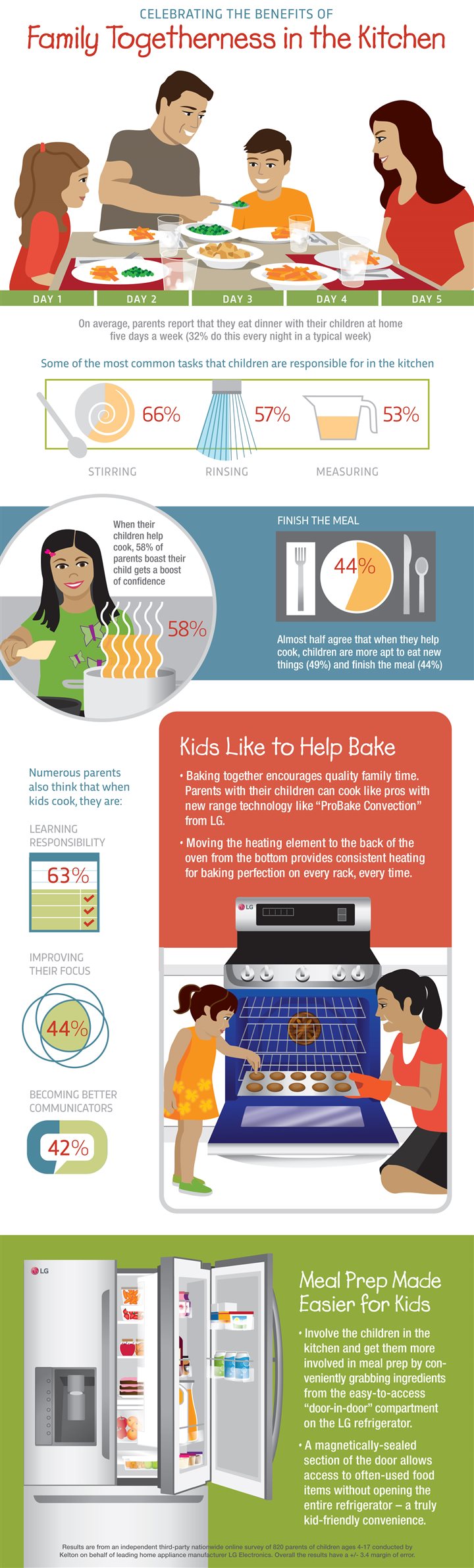 (BPT) - A recent survey by LG finds that today’s children are most likely to be found in the kitchen before family meals begin, helping their parents with everything from rinsing and mixing to the dreaded cleanup. More good news for families today is that the tradition of dinnertime isn’t going anywhere either. Most parents make time for family dinners at home on a regular basis and have successfully ensured minimal distractions during this meal.