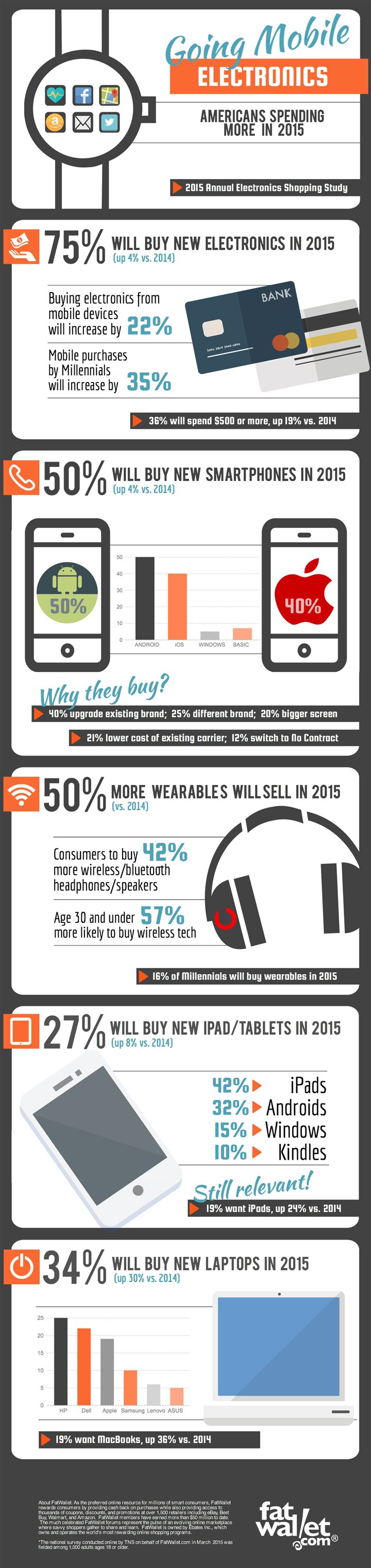 (BPT) - A whopping 50 percent of American adults plan to buy new smartphones this year, according to a new electronics shopping study from FatWallet (TNS Global). A new Apple Watch release will influence millennials looking to buy into the wearables market, as the study reports the group will buy 50 percent more wearables in 2015. FatWallet.com is a one-stop site to compare and stack consumer electronics deals and online coupons with cash back from 1,700 retailers, including Best Buy, Newegg, Samsung and Apple Store.