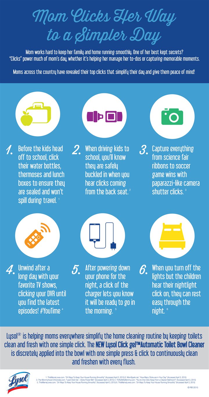 (BPT) - Mom works hard to keep her family and home running smoothly. One of her best kept secrets? “Clicks” power much of mom’s day, whether it’s helping her manage her to-dos or capturing memorable moments. Lysol is helping moms everywhere simplify the home cleaning routine by keeping toilets clean and fresh with one simple click. The NEW Lysol Click gel (TM) Automatic Toilet Bowl Cleaner is discretely applied into the bowl with one simple press and click to continuously clean and freshen with every flush.