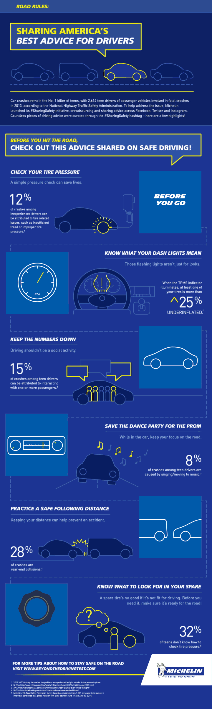 (BPT) - Car crashes remain the No. 1 killer of teens, with 2,614 teen drivers of passenger vehicles involved in fatal crashes in 2013, according to the National Highway Traffic Safety Administration. To help address the issue, Michelin launched its #SharingSafety initiative, crowdsourcing and sharing advice across Facebook, Twitter and Instagram. Countless pieces of driving advice were curated through the #SharingSafety hashtag – here are a few highlights!
