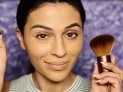 Step 4. Now it’s fine to add that sun-kissed glow! Pick up your EcoTools Angled Kabuki Brush and dip it into your bronzer. It’s best to use a bronzer with a bit of shimmer to get that extra radiant look. Start applying around your hairline, and then sculpt your cheeks and lightly swipe all over for an even finish. The large brush head allows for quick and natural application.