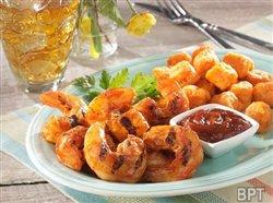 Wrap the bacon slice around the bunch of thyme and tie with kitchen twine so you have a nice bundle. Heat about 2 tablespoons of oil in a large saucepan over medium heat. Add the bacon-wrapped thyme and cook slowly for 3 to 4 minutes to render the bacon fat and give the sauce a nice smoky taste. Add the remaining ingredients, give the sauce a stir and turn the heat down to low. Cook for 20 minutes to meld the flavors. Once the sauce is done cooking, remove the thyme bundle and discard. Take about 1 1/2 cups of the sauce and reserve for serving alongside the shrimp. Pair with Alexia Sweet Potato Puffs or try grilling Alexia Waffle Cut Sweet Potato Seasoned Fries.