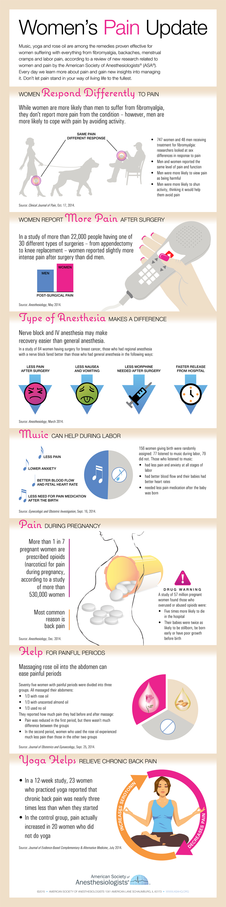 (BPT) - Everyone feels pain at some point. Women have a particularly interesting relationship with pain – childbirth is considered to be one of the most painful experiences and in general, women report having more pain than men. A recent analysis of peer-reviewed scientific research published in 2014 focused on women and pain revealed studies that shed light on how women cope with pain, whether from surgery, labor, back pain or painful periods, and insights into how physicians are improving pain treatment strategies for their patients. Follow this infographic to see the results.